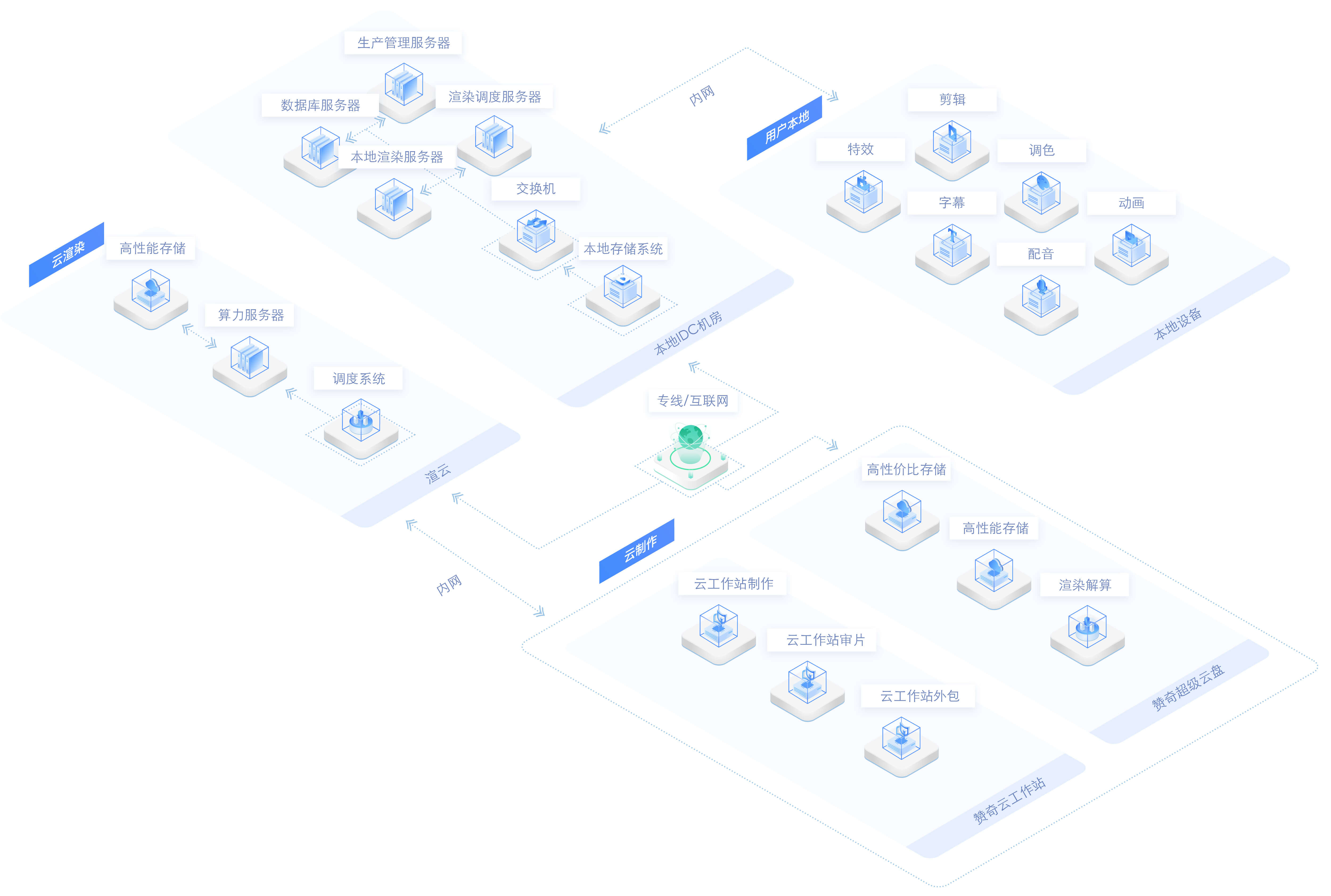 影视项目中,通常都有档期要求,需要在指定时间交付项目,需求较集中,本地资源无法弹性匹配当前需求,影响交付时间;若扩建本地资源不仅设备成本高,运维难度大,且项目结束后设备闲置,造成资源(设备资源和电力资源)浪费。